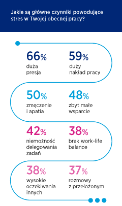 Na poziom satysfakcji wpływa wiele czynników, w tym także emocje towarzyszące realizacji powierzonych zadań. Ponad połowa zatrudnionych codziennie irytuje się i mierzy z brakiem motywacji. Zdecydowana większość doświadcza również wysokiego poziomu stresu, który w wielu przypadkach działa destrukcyjnie.