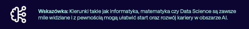 Z naszego doświadczenia współpracy z wieloma pracodawcami poszukującymi osób na stanowisko AI Specialist wynika, że formalne wykształcenie techniczne zazwyczaj nie jest wymagane. Warunkiem jest jednak to, by kandydat wykazywał się dużą pasją do IT oraz chętnie zdobywał wiedzę lub miał naturalne zacięcie techniczne. Wówczas rozpoczęcie od zera jest możliwe, lecz wymaga dużej determinacji i zaangażowania.