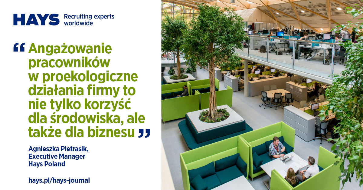 Prowadzenie biznesu odpowiedzialnego społecznie jest dla wielu kandydatów solidnym argumentem za podjęciem współpracy z daną firmą. Co więcej, jak wynika z badań Hays Poland, kultura organizacyjna, w którą włącza się również etyka prowadzonej działalności, jest najważniejszym elementem wpływającym na satysfakcję z pracy lub jej brak. To również powód, dla którego pracownicy decydują się na zmianę miejsca zatrudnienia. Jednocześnie biorąc pod uwagę, jak ważnym tematem są w debacie publicznej kwestie klimatyczne, stosunek firmy do działań proekologicznych dodatkowo zyskuje na znaczeniu.