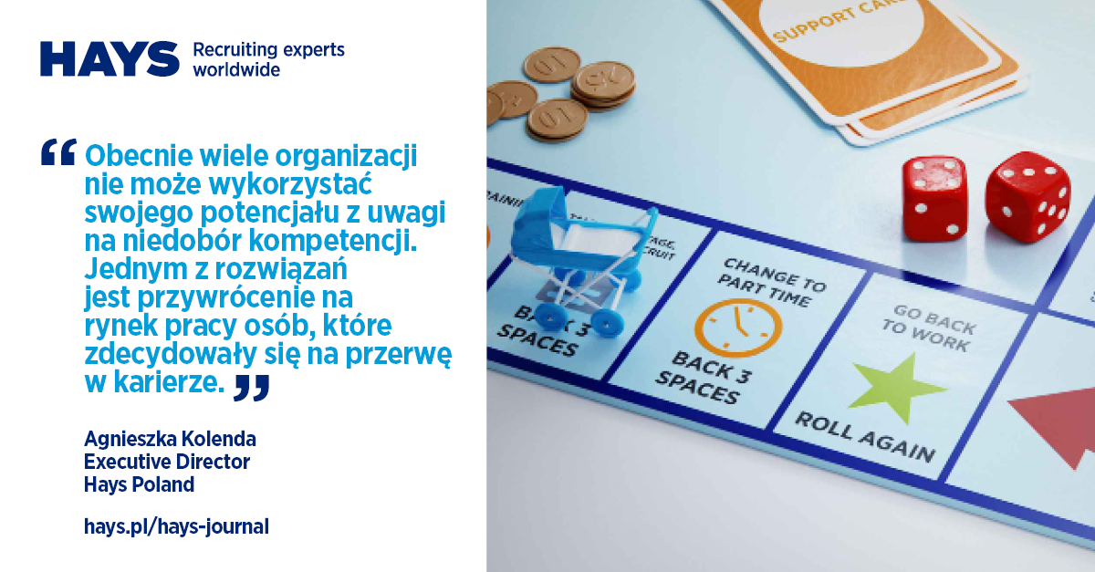 – Obecnie wiele organizacji, z uwagi na niedobór kompetencji, nie może w pełni wykorzystać swojego potencjału – zaznacza Agnieszka Kolenda, Executive Director w Hays Poland – Jednym z dostępnych rozwiązań jest przywrócenie na rynek pracy osób, które posiadają cenne kompetencje, lecz zdecydowały się na przerwę w karierze. Niektóre firmy dostrzegają korzyści aktywizacji tej grupy na rynku pracy i organizują programy, które mają ich do tego zachęcić – dodaje.
