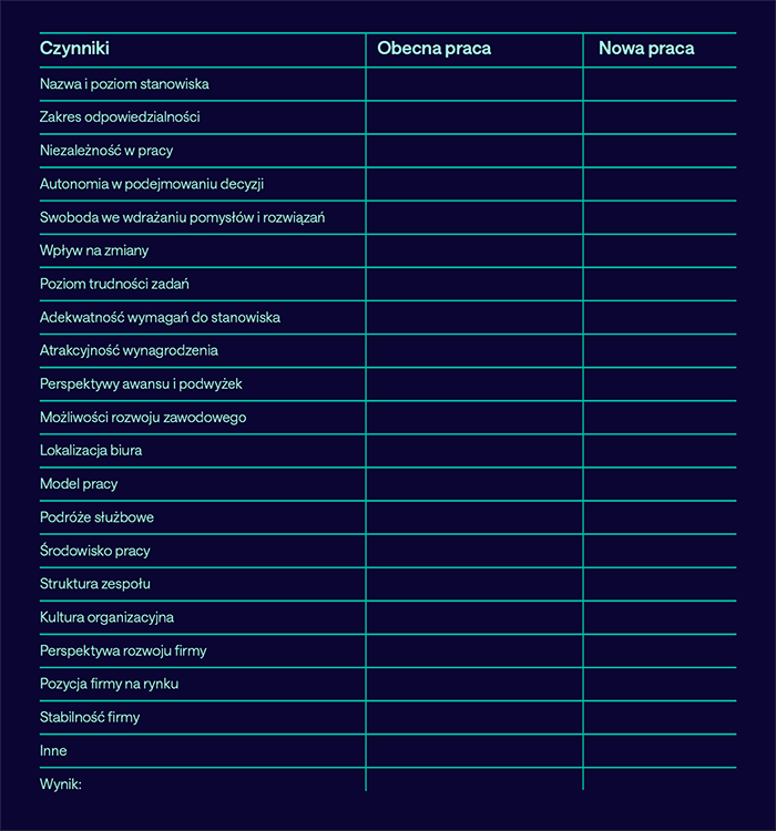 Wszystkie etapy rekrutacji masz już za sobą, a firma wyraziła chęć współpracy? Brawo! Przed Tobą decyzja o tym, czy chcesz ostatecznie przyjąć ofertę pracodawcy. Pomoże Ci w tym poniższe ćwiczenie, które skłania do dokładnej refleksji.