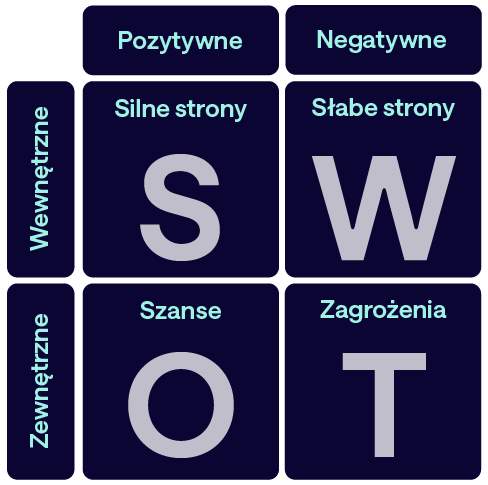 Z kolei szanse i zagrożenia to czynniki zewnętrzne – zastana rzeczywistość, na którą nie masz wpływu. Pierwsze z nich to pozytywne elementy kształtujące środowisko, np. duże zapotrzebowanie na osoby z Twoim wykształceniem i umiejętnościami, nowe inwestycje w regionie lub dynamiczny rozwój branży, w której pracujesz. Natomiast zagrożenia to zjawiska negatywne, takie jak zbyt duża liczba wykwalifikowanych osób, kryzys gospodarczy, zwolnienia grupowe, czy fuzje i przejęcia największych firm w Twojej branży.
